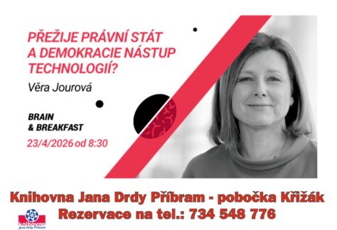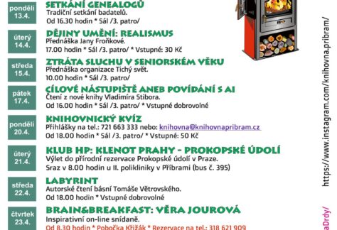 3. - 6. Duben 2026 Jak bude mít knihovna otevřeno o Velikonocích 8. - 1. Duben - Květen 2026 Kulturní akce v dubnu 2026 9. Duben 2026 Keňa a jezera hrochů 13. Duben 2026 Setkání genealogů 14. Duben 2026 Dějiny umění s Janou Froňkovou: Realismus 15. Duben 2026 Ztráta sluchu v seniorském věku 17. Duben 2026 Vladimír Stibor: Cílové nástupiště aneb Povídání si s AI 20. Duben 2026 Knihovnický kvíz 21. Duben 2026 Klub HP: Výlet do Prokopského údolí 22. Duben 2026 Labyrint: Autorské čtení 23. Duben 2026 Brain&Breakfast: Věra Jourová