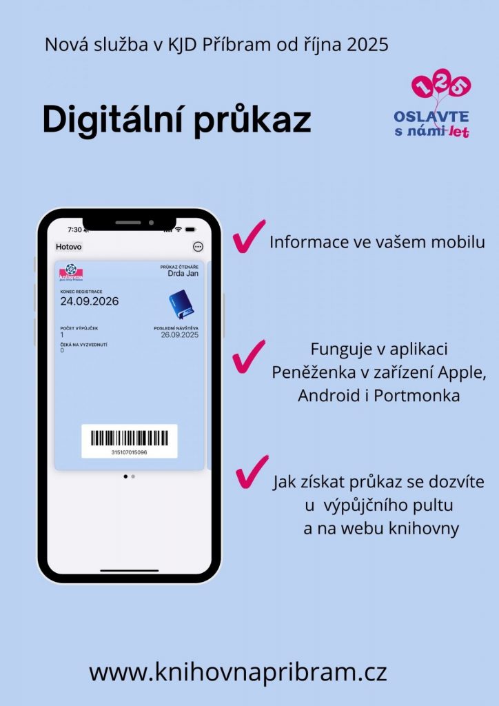 Digitální průkaz je uložen přímo ve vašem chytrém telefonu jako digitální karta v aplikaci Peněženka (Google Peněženka, Apple Peněženka, Portmonka). Slouží k identifikaci v knihovně namísto klasického průkazu. Obsahuje čárový kód vašeho čtenářského čísla, který lze načíst skenerem přímo z obrazovky.