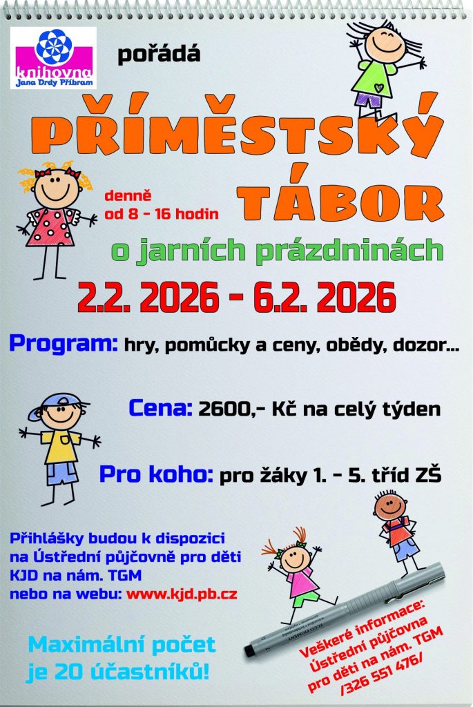 Jarní příměstský tábor Knihovny Jana Drdy 2026 KJD pořádá již tradičně jarní příměstský tábor pro děti od 1. do 5. tříd. Info_jarní_tábor_2026Stáhnout Přihláška jarní tábor 2026Stáhnout