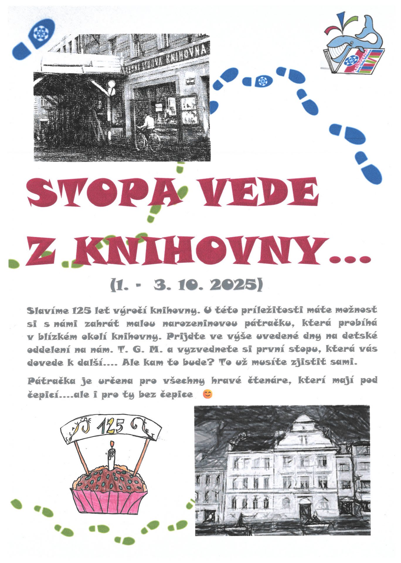 Slavíme 125 let trvání veřejné knihovny v Příbrami. Zahrajte si s námi malou narozeninovou pátračku v okolí knihovny (1. – 3. října 2025). Do 3 října dostanete první stopu v Ústřední půjčovně pro děti KJD na náměstí T. G. Masaryka.