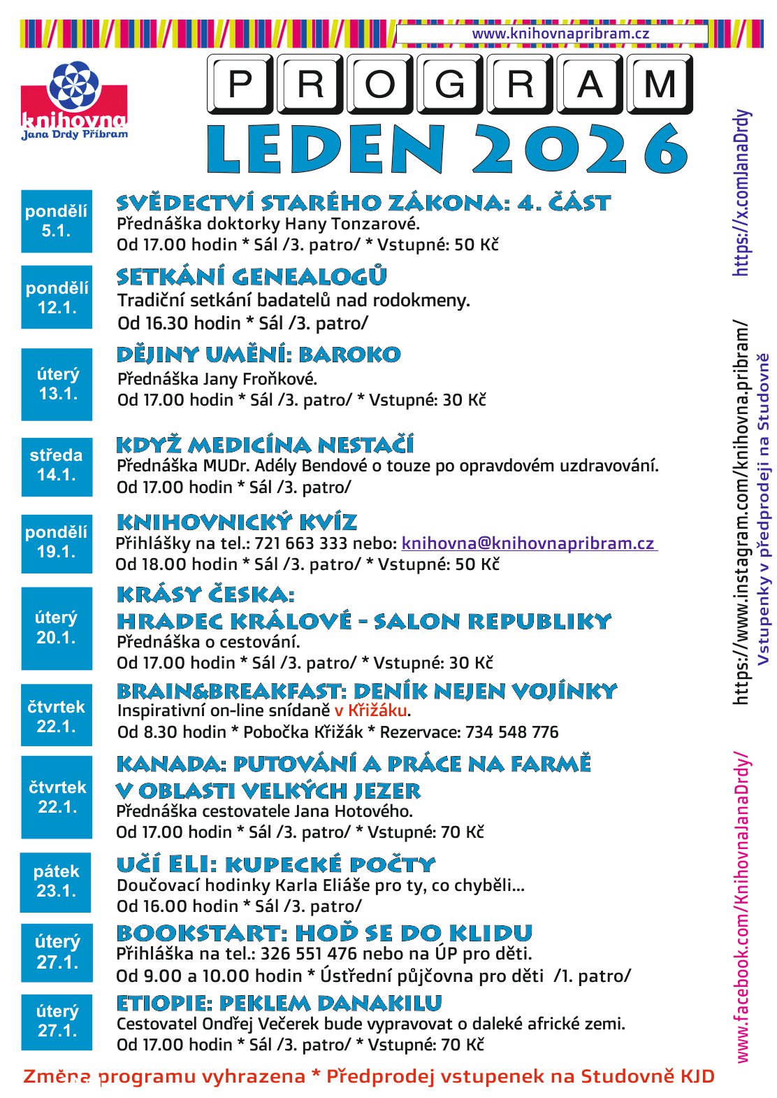 Program na leden 2026 + Přidat do Google kalendáře + iCal / Outlook export Další akce Prosinec 2025 Pro 01 - 31 2025 Výprodej knih na Březových Horách Pro 22 2025 - Led 04 2026 Otevírací doba o Vánocích Leden 2026 Led 05 - 27 2026 Program na leden 2026 Led 05 2026 Svědectví Starého zákona: 4. část Led 12 2026 Setkání genealogů Nebyla nalezena žádná událost!